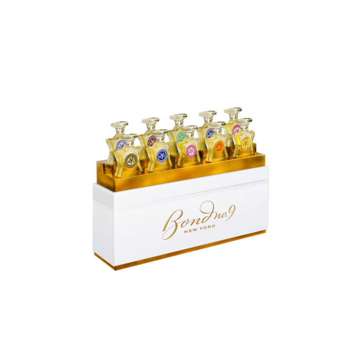 Bond No. 9 New York The Perfumista’s Perfect Ten – Imagine the Bond No. 9 superstar flacon precisely scaled down to 5 ml. How beguiling! Then imagine a wardrobe of ten such flacons-each containing a different best-selling eau de parfum–standing at attention in a beautifully embossed coffret. What an exquisite dream-gift that will turn any fashionista into a devout perfumista-and vice versa.