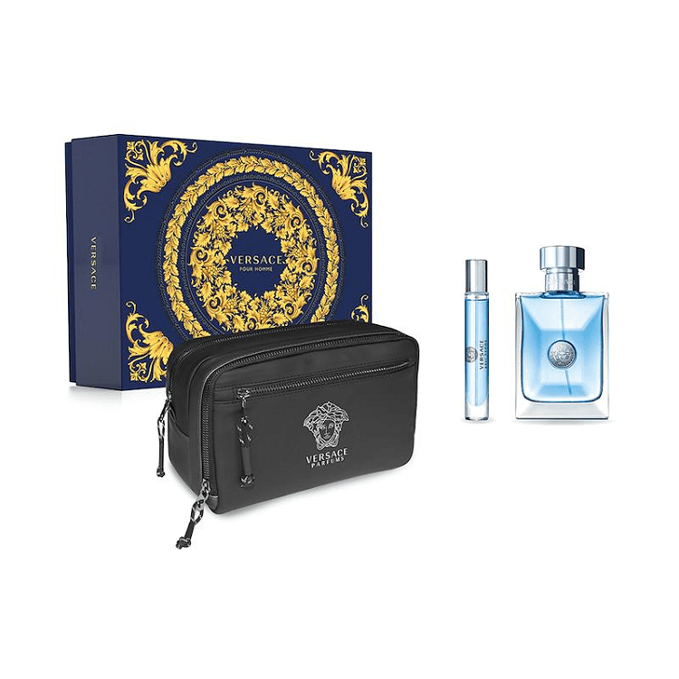 Versace Pour Homme 3 pcs Gift Set. Gift Set Contains 100ml EDT Perfume, 10ml Miniature and Pouch Set. Versace Pour Homme Cologne by Versace, An exciting and modern twist on a classic aromatic/Fougere for men, this masculine contemporary scent was created by master perfumer Alberto Morillas. Top notes are citruses, neroli, bergamot and petit grain; middle notes are hyacinth, clary sage, cedar, and geranium; base notes are tonka bean, musk, and amber. All our products are 100% original, authentic name brands. We do not sell fake or counterfeit products.